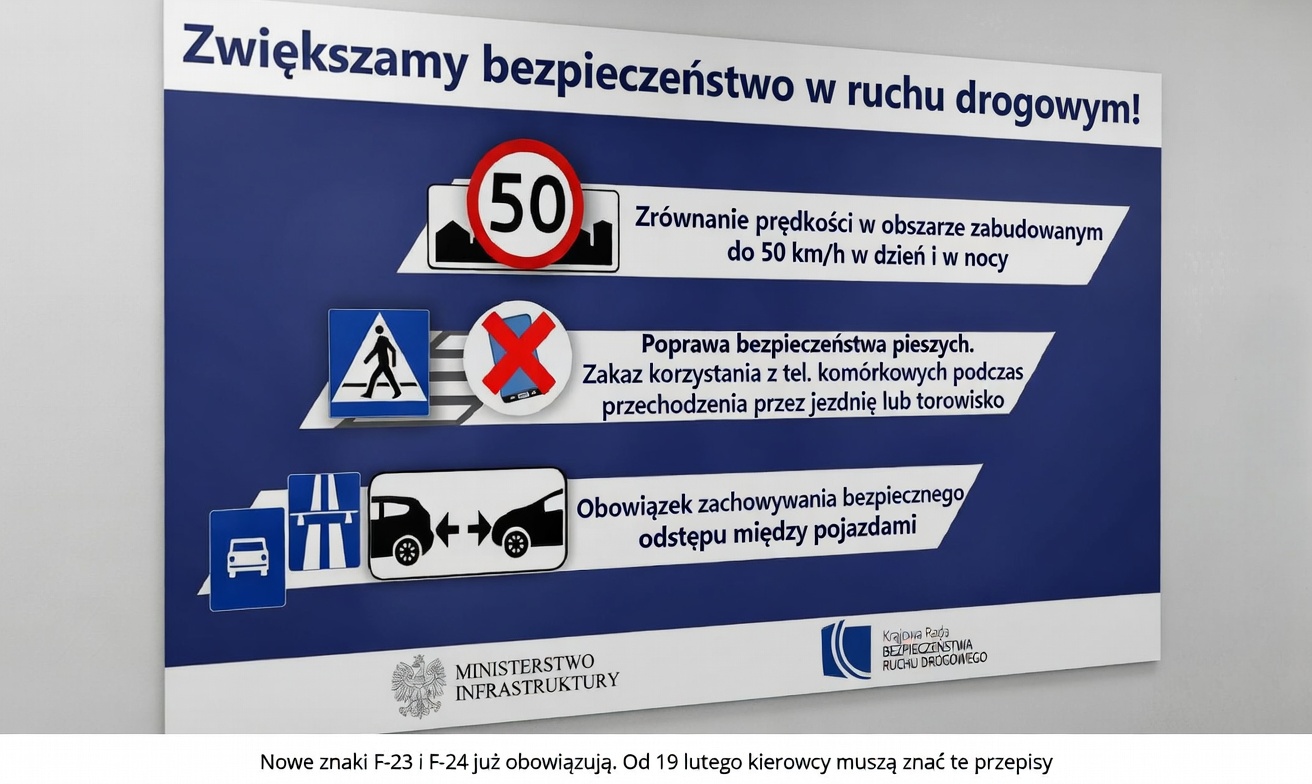 Od 19 lutego 2026 roku na polskich drogach obowiązują nowe przepisy dotyczące oznakowania. Wprowadzono między innymi znaki F-23 i F-24, które mają zwiększyć bezpieczeństwo ruchu drogowego.